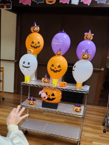 遅くなりましたが、10月30、31日にハロウィンパーティーを開催しました!利用者の皆様には、レクリエーションで「お化け風船、的当てゲーム」に挑戦して頂きました。みなさん、風船を狙ってたくさん当てていました。楽しんで頂けました。