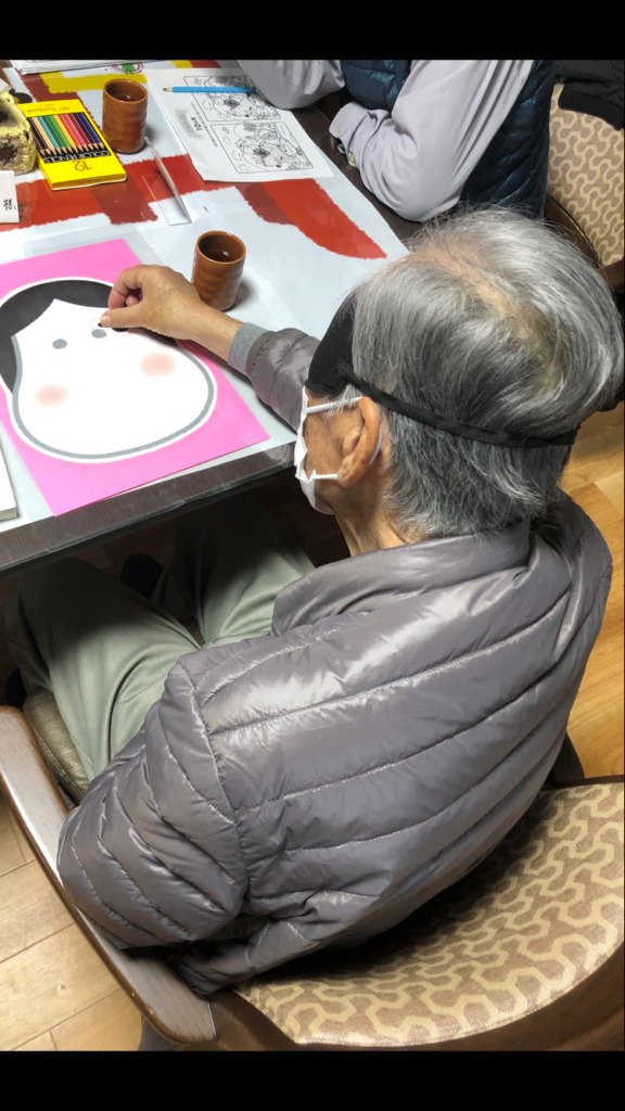 お正月週間ということで、デイサービス蓮では、利用者の皆様に個人レクリエーションとして福笑いにチャレンジしていただいています。アイマスクで目隠しをして行うため、目が下のほうにあったり、口が歪んでいたり、おもしろい福笑いがたくさんできました!