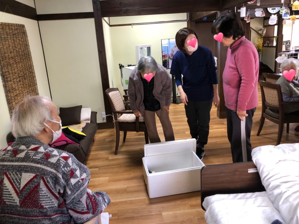 れんスタッフが、突如として持ってきた発泡スチロールの箱、その中に入っていたのは、なんと大きい魚(スズキ)!利用者様は、箱の中身を見て「おお~」と声をあげて覗き込んでおられました。
