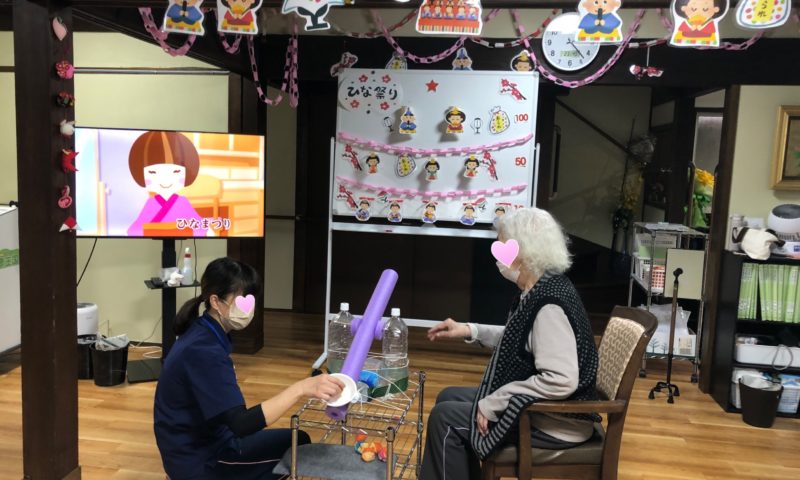 3月3日から、ひな祭りウィークと題し、利用者の皆様には、レクリエーションで「ひなあられ、カップインゲーム」にチャレンジしていただいています♪ひなあられに見立てたお手玉をホワイトボードに貼ってあるカップに入れて点数を競い合いました。皆様、「難しいなぁ」と言いながらも、果敢に挑まれていました!