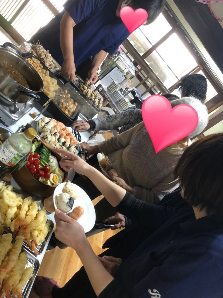 皆様、順番にスタッフと一緒にお好きなおかずをお皿に取っていました!焼き鳥におでんに大人気の天ぷらまで、たくさんあり利用者の皆様に喜んでいただきました!