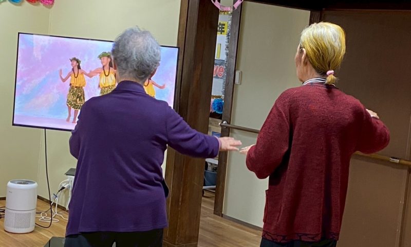 今度は、利用者様全員でフラダンスを真似して一緒に踊ってみましょうね♪