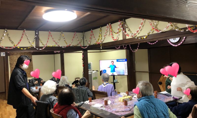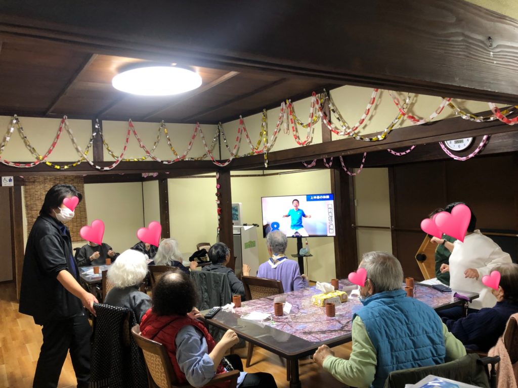 ここ最近、帰る前の体操と称し、Youtubeを観ながら利用者の皆さんで、軽く体操をしていただいています。皆さん、テレビ画面を見ながら一生懸命、真似をして体を動かされています。しっかり体操をして、おなかを空かして、自宅に帰ったら、おいしいご飯をたくさん食べて、また元気にデイサービスに来て、みんなで一緒にいっぱい遊びましょう!