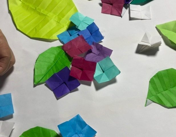 5月22日木曜日、6月も近いので利用者の皆さんでアジサイを作っています♪あじさいの花びらや葉っぱを折り紙で作り、それを白い用紙にのりで貼り付け、あじさいを表現しました。