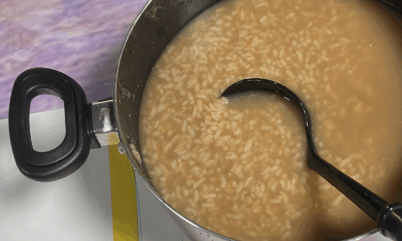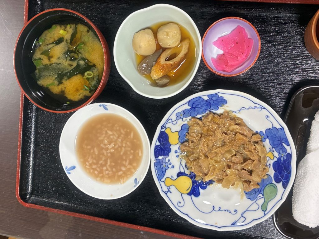 7月18日金曜日、今日のお昼のメニューは、豚の生姜焼きにお味噌汁、ちくわと里芋の煮物、そして、なんとご飯は茶粥(おかいさん)!