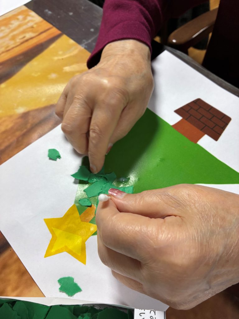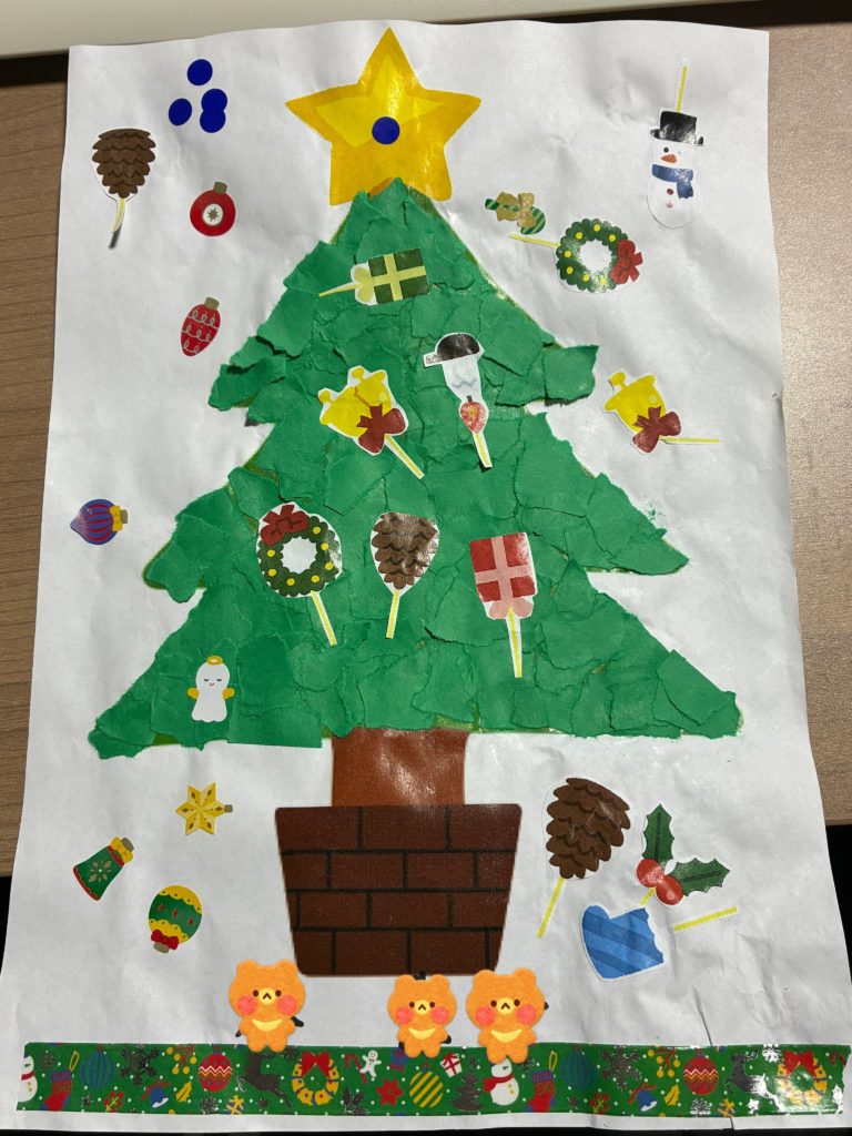 12月1日から1週間、工作レクと題し、利用者の皆様には「貼り絵!クリスマスツリー」を製作していただいています。